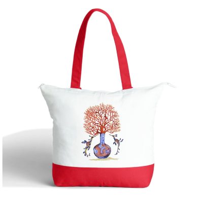 This zippered durable canvas tote bag is made with a sturdy 100% cotton canvas and has a fetching blue base to rest it’s weary haunches upon with matching double carry handles… It also has an additional zippered interior pocket. This one features my tea drinking koala printed on one side of this roomy bag.