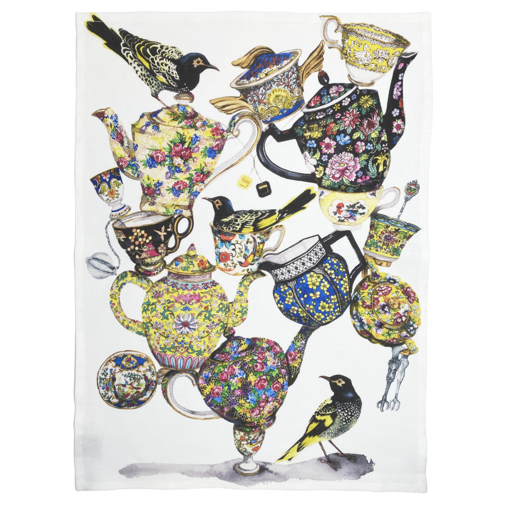 This generous 100% linen tea towel at 50cm x 68cm is designed in Mudgee and printed and made in Australia. This tea towel features a precarious pile of precious porcelain perched upon by critically endangered regent honeyeaters.