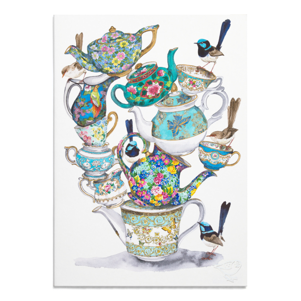 Wrangling wrens wrestling on precarious piles of precious patterned porcelain pieces.
